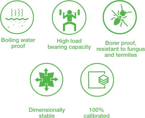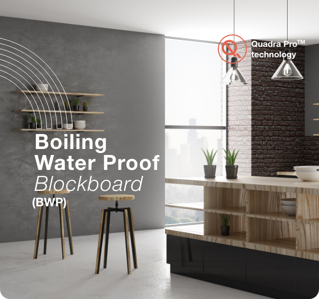 Greenpanel BWP Blockboard is manufactured from 100% kiln seasoned hardwood species bonded with BWP type synthetic resin, pressed at very high temperature and pressure that ensures excellent dimensional stability and uniform surface quality. Double layer cross bands on top and bottom of the assembly make the blockboard stiff and warp free.