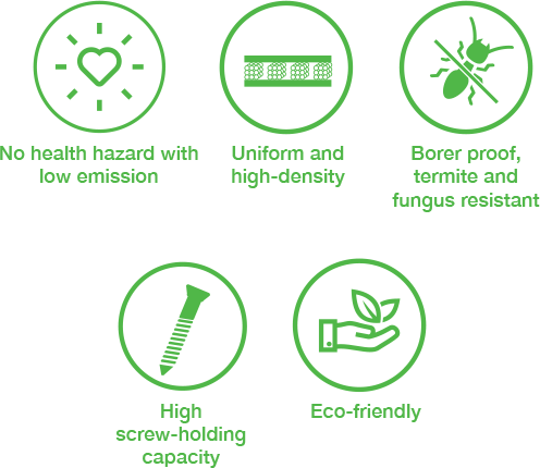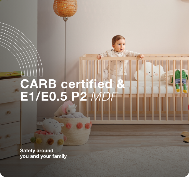 Certified by California Air Resources Board (CARB) and European standards, Greenpanel CARB certified & E1/E0.5 P2 MDF is known for its low formaldehyde emission that ensure toxin-free indoor environment, making it safe for kids and families. This environment-friendly wood panel product is sourced responsibly from sustainable hardwood agro-forests. It is a preferred choice due to its high bending strength, load-bearing capacity, screw holding capacity, and above all, its certified safety that makes it suitable for kitchen, furniture, educational and learning instruments, toys, etc.