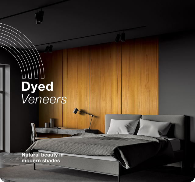 Dyed Veneers make your living spaces stand out, adding a pop of colours along with enhanced wood grains and textures. Having been through a pressure cooking, bleaching and dyeing process, Dyed Veneers offer consistency, complete colour correctness and uniform tone across the sheet. A perfect blend of traditional beauty of natural wood and modern shades, Dyed Veneers give you a wide range of options to make your furniture and walls adhere to your limitless imagination.