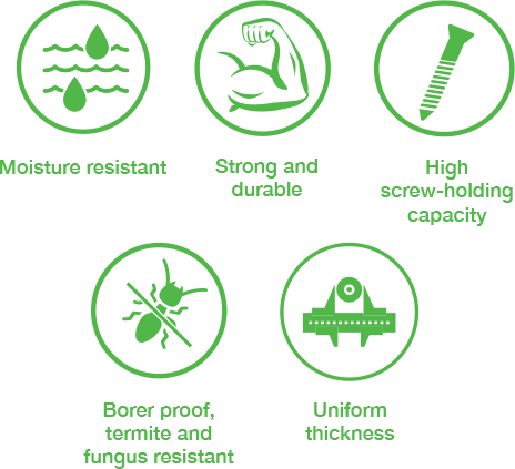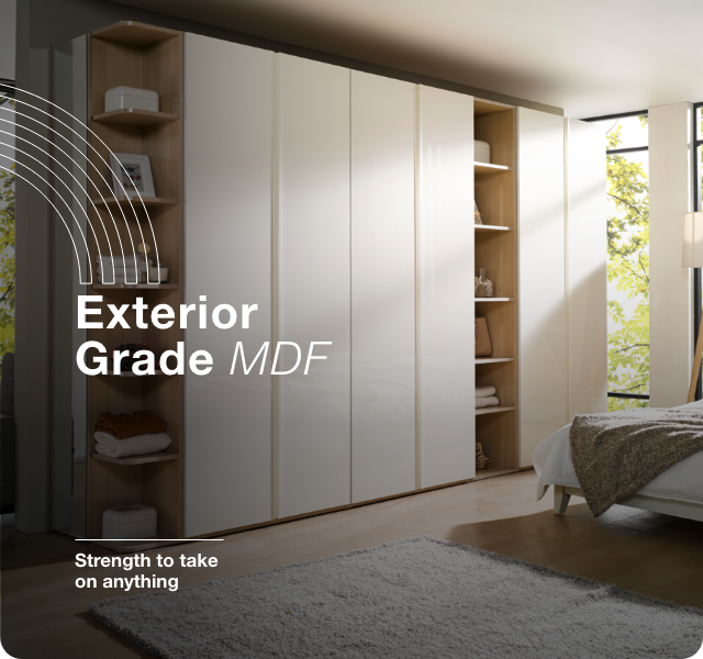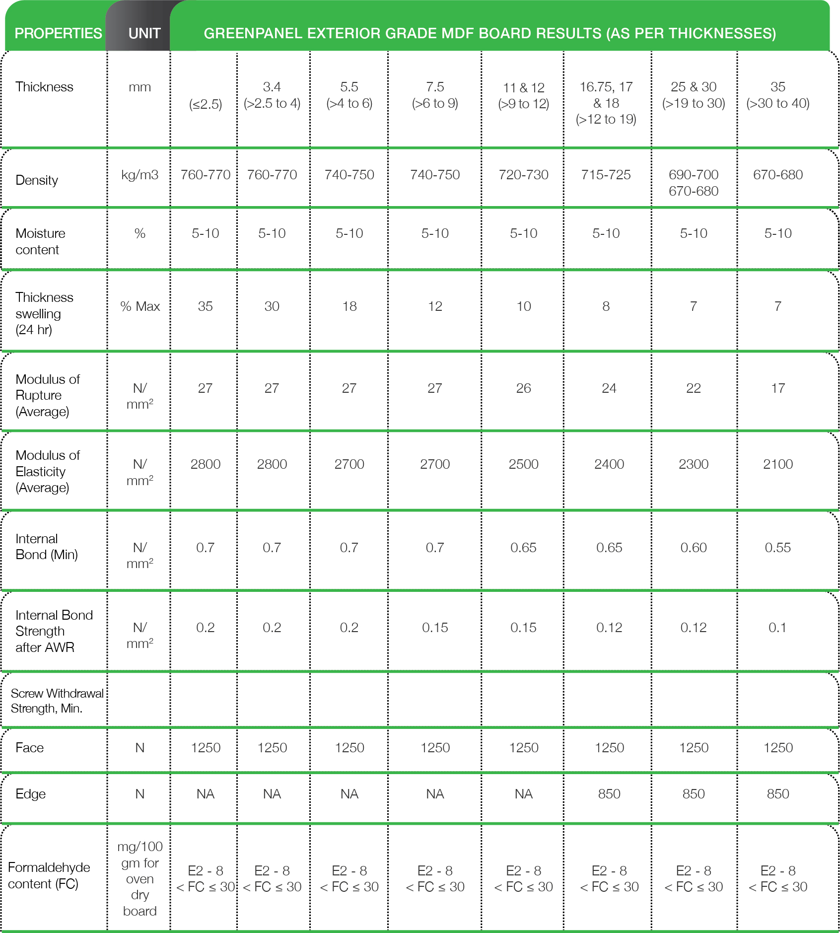 Greenpanel Exterior Grade MDF is engineered for greater density and strength. Ideal for water prone and humid conditions, it is the perfect branded solution for a wide range of semi-outdoor and outdoor applications, as per the latest BIS standards. In addition to being water resistant, it is borer proof and resistant to fungus and termites. Thanks to the high-quality melamine resin used, Greenpanel Exterior Grade MDF has an added edge in terms of internal bonding between fibres, dimensional stability and thickness swelling.